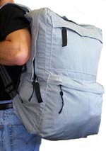 A bag that can be carried in two ways. Girded by Type VI webbing, folded and sewn into non-curling palm fitting handles for carrying. Additional webbing with slide adjusters can be slipped through arms for carrying on your back. Straps are placed so that the load is carried high on the shoulders, like a mountaineer's backpack. Two industrial type zippers open from the top of the bag and are extra long for easy packing and unpacking. Deep pockets inside for a collection of small items. 28" long, 11" wide, and 16" high. Made from Para-Pack nylon fabric.